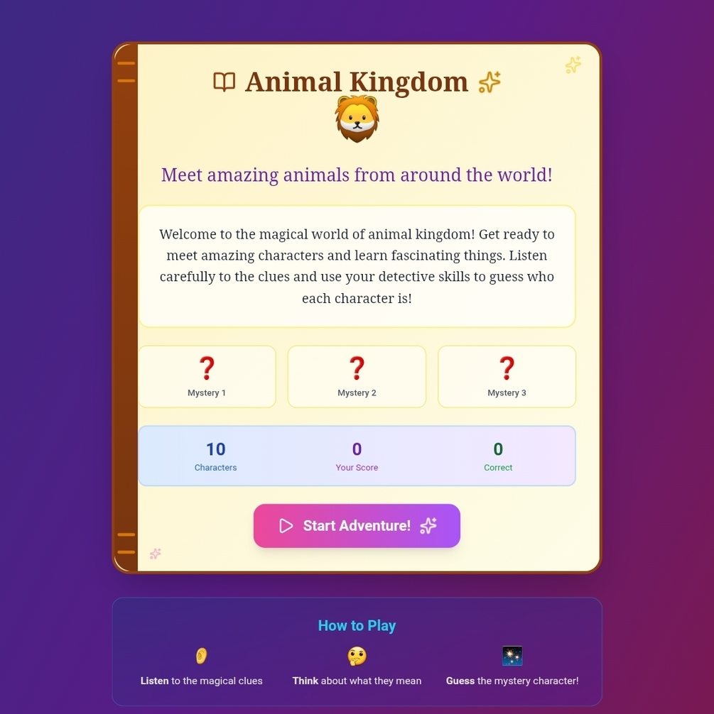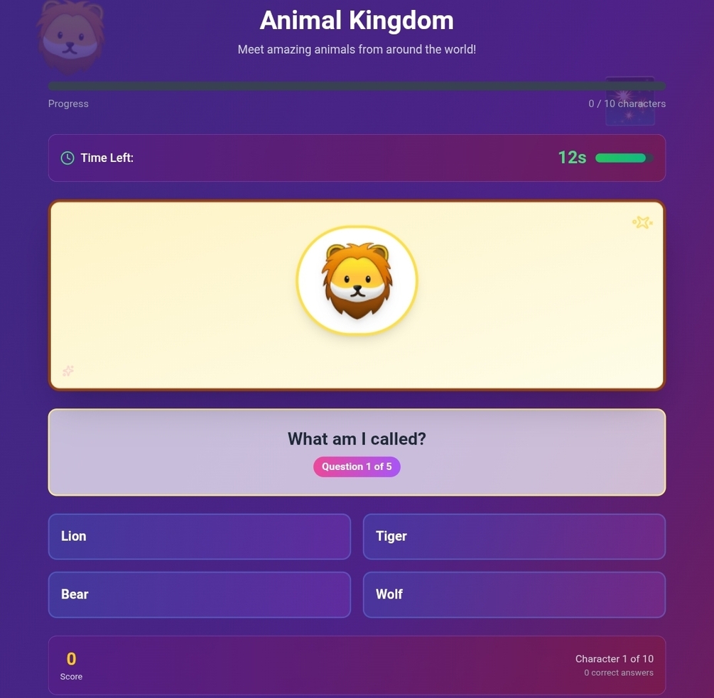 Guess The Character is a premium, interactive educational learning game designed specifically for kids ages 3-10. This engaging character guessing game combines entertainment with education, featuring 11 diverse learning topics, 102 lovable characters, and 300+ carefully crafted quiz questions that make learning fun and memorable!